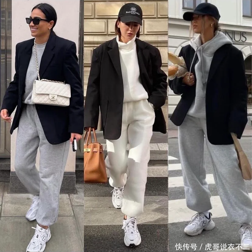 卫衣和束脚卫裤就是不错的选择,它们能为西服造型增添一抹休闲感。但在颜色搭配上要注意保持和谐统一,避免过于鲜明的对比色破坏整体造型的质感。例如,穿黑色西服时,卫衣和卫裤可以选择黑白灰等中性色进行搭配。
