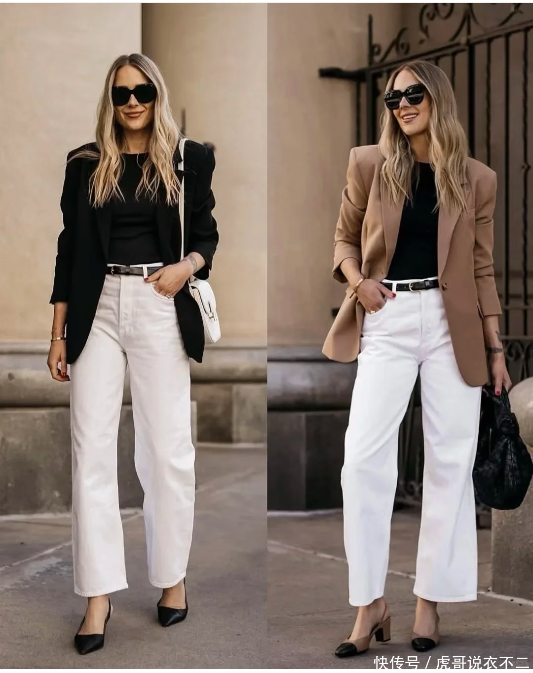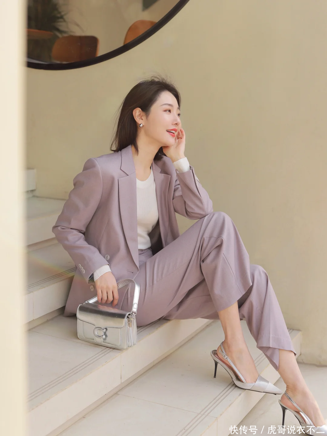 为了打破黑色西服的沉闷感,可以选择卡其色、白色或米色系的西服,这些颜色既知性又年轻。同时,为了避免过于休闲的鞋子破坏职场穿搭的正式感,皮质乐福鞋或者尖头鞋是一个不错的选择,它比小白鞋更有质感,更符合职场氛围。