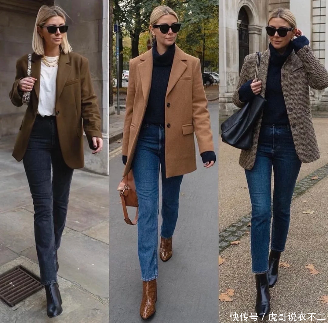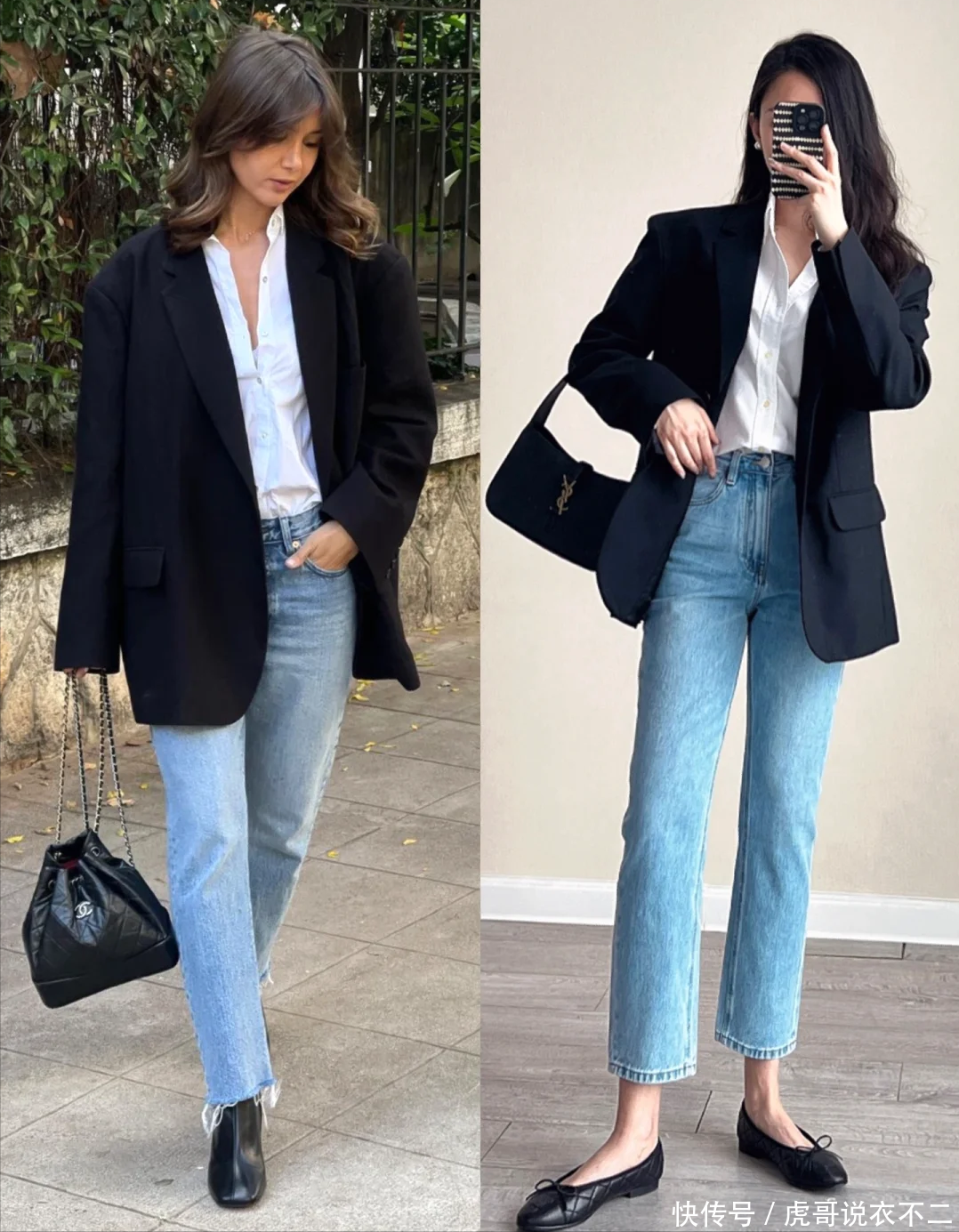 牛仔材质自带的休闲调性能够中和西服的硬朗感,让整体造型更加轻松自在。黑色西服与蓝色牛仔裤的搭配尤为经典,小直筒裤型能够轻松修饰腿型,展现出又细又直的美腿效果。