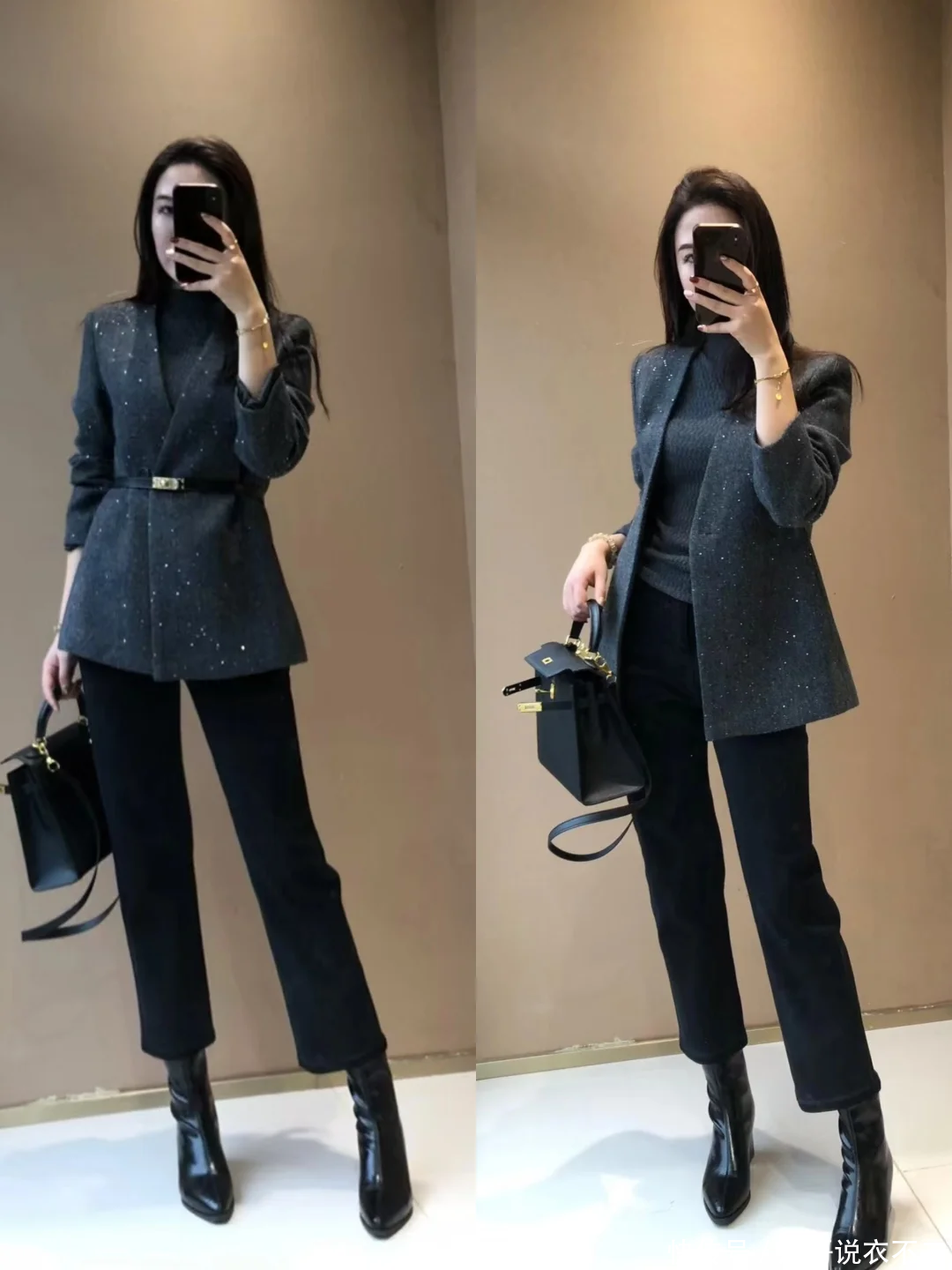 职场女性在选择西服搭配时,可以考虑九分小黑裤。